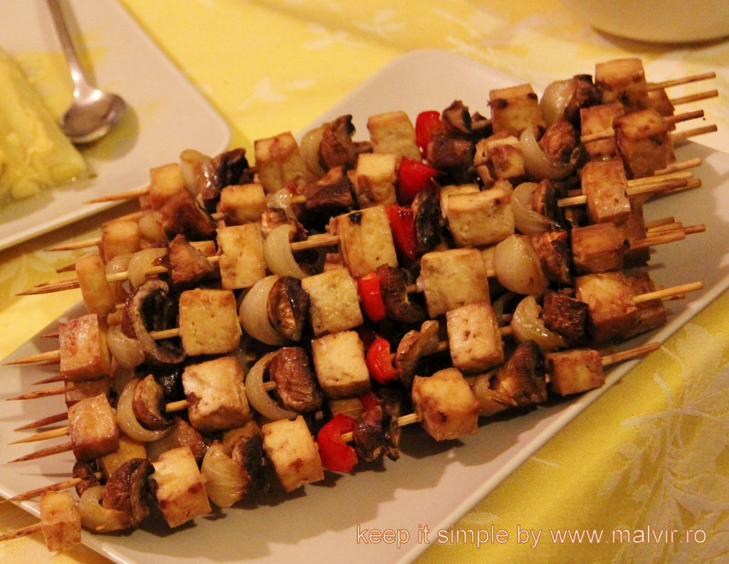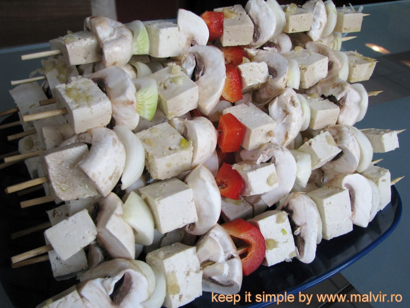 Sarati bucatile de tofu si de legume. Asezati pe betele de frigarui ingredientele taiate in bucati intercalate.