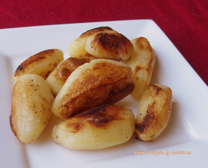 Put the boiled potatoes in a pan greased with a little olive oil, add salt and put in the oven for about half an hour until they brown at a temperature of 200 degrees Celsius. When they are ready, take them out and pour olive oil on top.