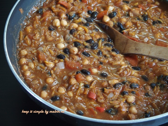 Ideea cu aceasta mancare mi-a venit dupa ce, in timpul unei iesiri cu cortul, am mancat o mancare similara facuta la ceaun (din conserve de boabe bineinteles) care a fost absolut delicioasa. Daca pana atunci copilul meu nu voia sa manance fasole, acel moment a schimbat complet gusturile lui. Sper sa va placa, este o mancarica proteica si aromata.