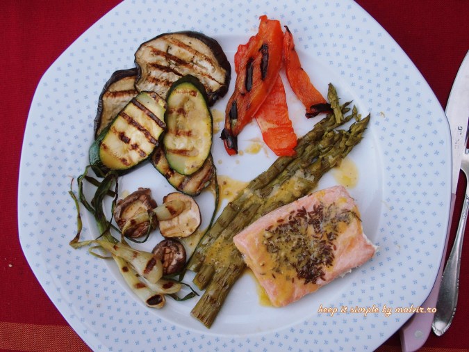 Preparati totul pe gratar pana se rumenesc legumele iar somonul se inmoaie. Somonul are nevoie de 20-25 de minute pana se patrunde; pentru siguranta verificati cu o scobitoare sau cu o furculita. Cand este gata, scoateti somonul din staniol si asezati-l impreuna cu legumele pe farfurii. Serviti cu dressing.