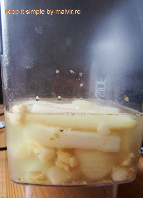 Taiati sparanghelul in bucati mici de 3-4 cm lungime si puneti la fiert alaturi de ceapa si usturoi, putina sare si supa de legume cat sa acopere toate ingredientele. Supa de legume se poate obtine din vegeta de casa. Fierbeti timp 25 de minute si lasati putin sa se raceasca.