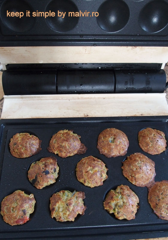 Varianta 2 – preparare in sanwich-maker cu tava de clatite: incalziti bine aparatul apoi puneti cu lingurita gramajoare din compozitie in fiecare alveola si coaceti pentru 5-7 minute pana se rumenesc.