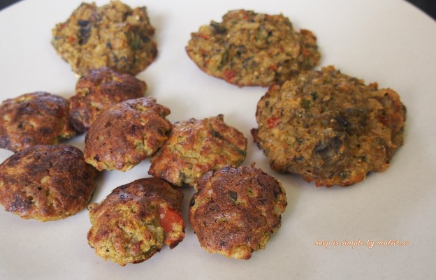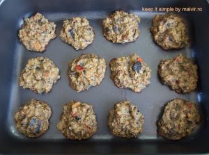 Varianta 1 – coacere in cuptor: preincalziti cuptorul la 200 grade Celsius si ungeti o tava cu unt de cocos topit. Luati cate o lingura din compozitie si formati chiftele rotunde pe care le asezati pe tava. Dati la cuptor pentru 30-40 de minute pana se rumenesc.