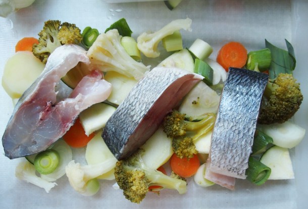 Pentru acest fel de mancare se pot folosi mai multe tipuri de peste: salau, macrou, dorada – eu am ales dorada deoarece mi se pare foarte gustoasa. Aroma data de combinatia dintre dafin si vin impreuna cu legumele inabusite la cuptor ii confera mancarii un gust aparte.