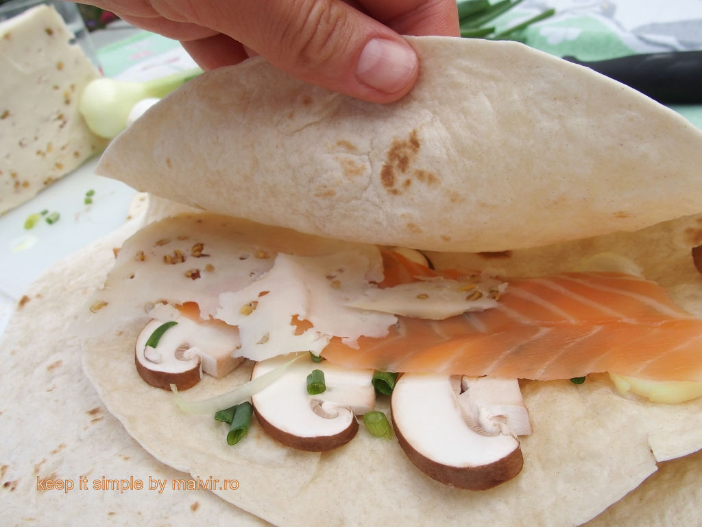 Indoiti lipia in doua pentru a vedea unde este jumatatea ei. Asezati ingredientele de mai sus in straturi subtiri pe jumatate de lipie avand grija ca branza sa fie deasupra deoarece se va topi si va lega celelalte ingrediente. Acoperiti cu cealalta jumatate a lipiei si puneti in gratar, acoperiti gratarul cu partea de sus; preparati la temperatura medie timp 3-5 minute pana se rumeneste.