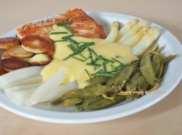 Este un sos destul de gras pentru gustul meu, insa mereu a fost o provocare pentru mine – sa reusesc sa-l prepar pana la capat fara sa se taie. Si pentru prima incercare a iesit foarte bine. Este un sos de unt cu gust acrisor asa ca l-am servit cu sparanghel fiert, peste si un pahar de vin alb langa.