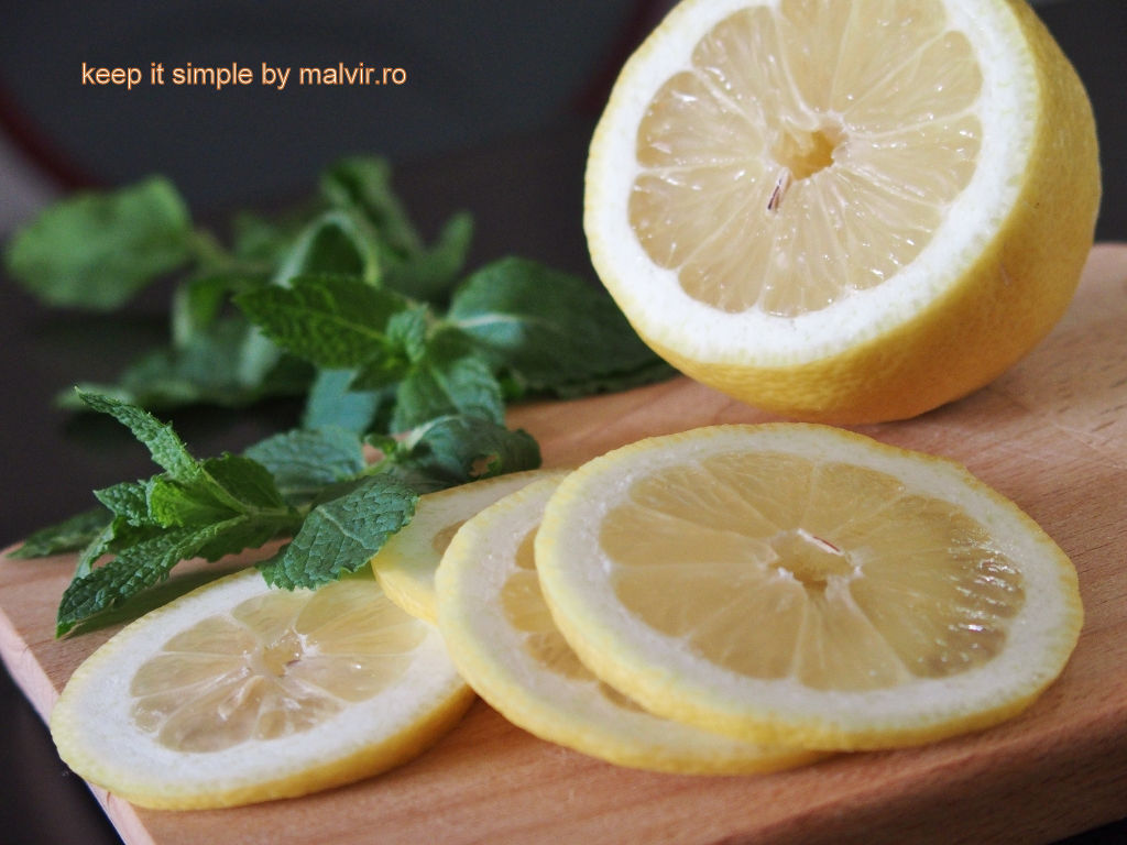Taiati lamaile in jumatati si stoarceti-le prin storcator; puneti frunzele de menta in blender cu o cana de apa si putina pulpa de lamaie ce rezulta dupa stoarcere. Mixati timp de 1-2 minute la putere maxima.