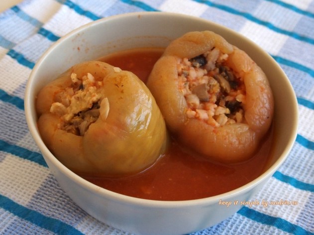 In functie de preferinte, sosul de rosii poate fi mai gros sau mai subtire. De aceea puteti adauga apa suplimentar peste sosul de rosii. Eu de obicei prefer mai mult sos si il prepar ca o supa crema pe langa ardei.