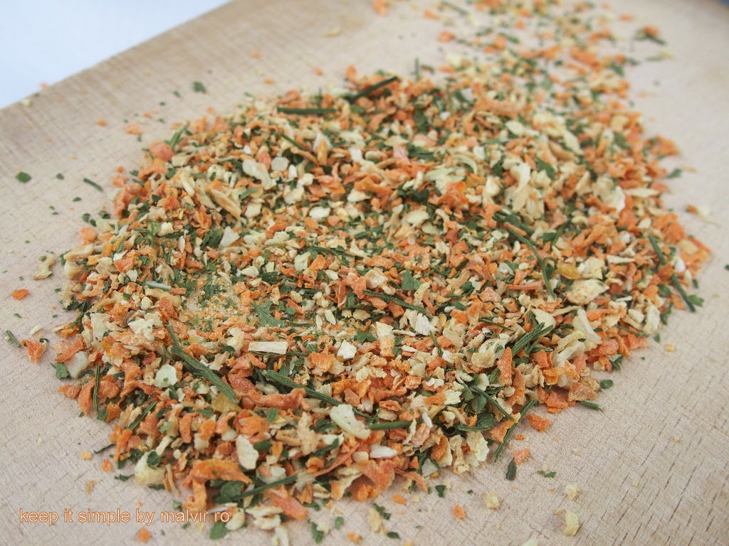 Asadar, ati obtinut o vegeta colorata, aromata si organica pe deasupra! Pastrati intr-un recipient inchis si ferit de umiditate.