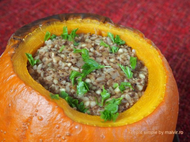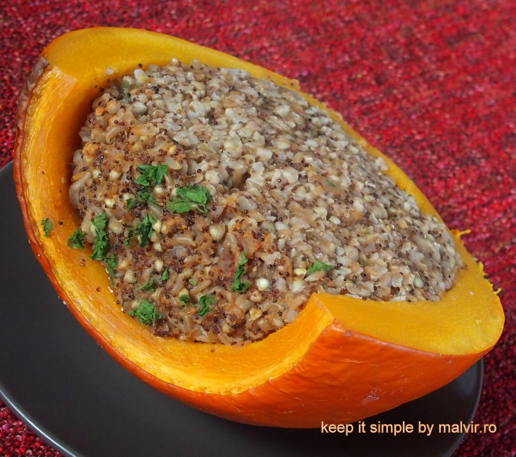 Pentru aceasta reteta am ales un dovleac nu foarte mare si nu foarte gras (cu un volum de aproximativ 1,25 kg) iar pentru umplutura am folosit o varietate de boabe pe care le-am tinut in apa timp de 12 ore inainte de a le gati. Iata reteta: