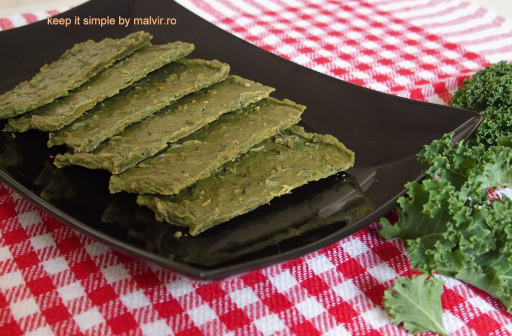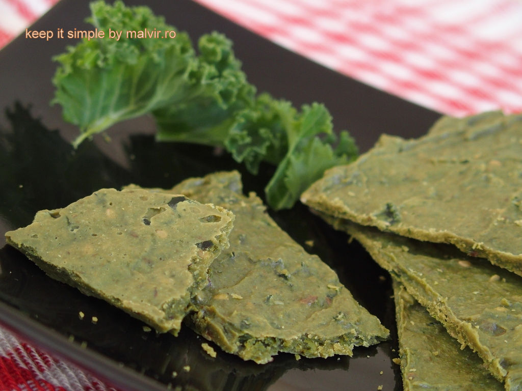 Tocati marunt frunza ramasa de kale (fara cotor) si adaugati peste compozitie impreuna cu semintele de susan si semintele de in. Amestecati bine.