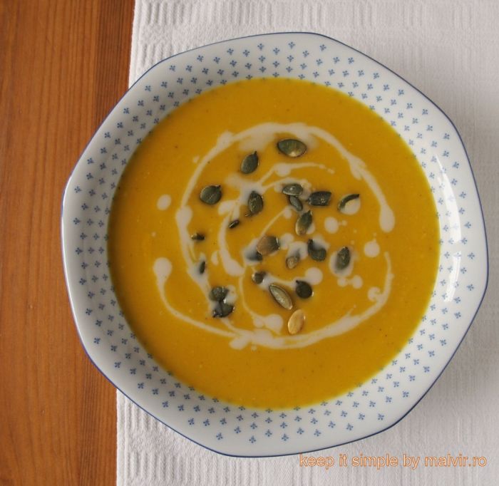Am servit cu smantana de ovaz (sau de soia) si seminte de dovleac crocante (reteta de seminte AICI). Se poate servi si cu crutoane de paine (reteta de crutoane de paine AICI). A fost absolut delicioasa!