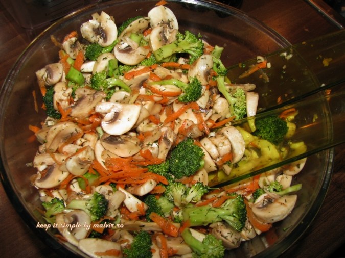 Taiati ciupercile feliute subtiri, taiati brocoli in buchetele mici, razuiti morcovii si maruntiti usturoiul.