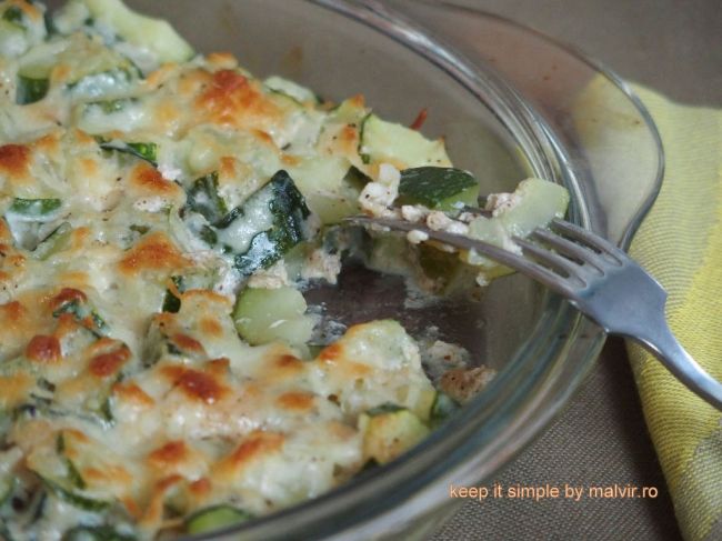 Puneti zucchini racit intr-un vas termoizolant, adaugati jumatate de branza razuita, crema vegetala, sare, piper, nucsoara si salvia. Amestecati bine pana se omogenizeaza apoi asezati compozitia uniform in vas si presarati deasupra restul de branza.