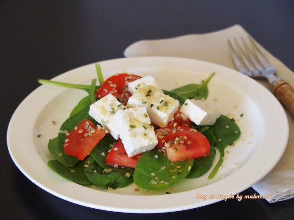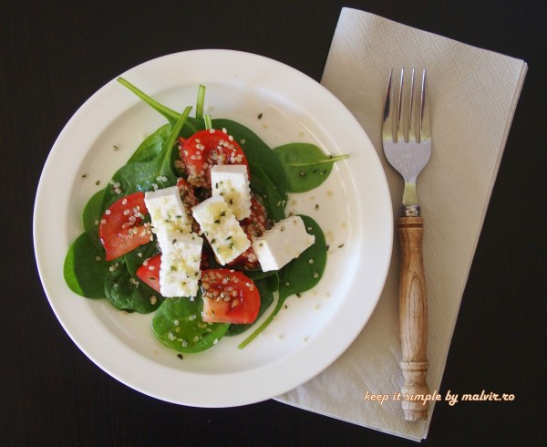 A venit primavara si odata cu ea o multime de legume crude, proaspete si pline de vitamine! In ultima saptamana am incercat aproape zilnic aceasta salata cu spanac si branza de capra pentru care am folosit frunze de spanac tanar, mai mici pentru a fi cat mai crude. Este deosebita!