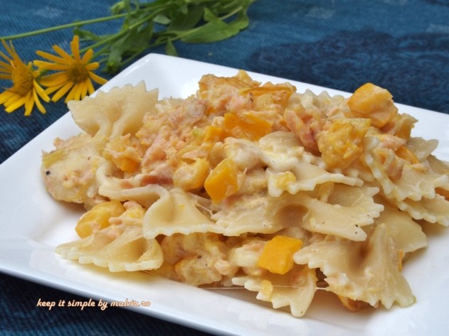 Adaugati usturoiul, mozzarella cubulete si ricotta si amestecati pana se topeste mozzarella. Adaugati piper si potriviti de sare daca mai este necesar – somonul este destul de sarat si s-ar putea sa nu fie nevoie.