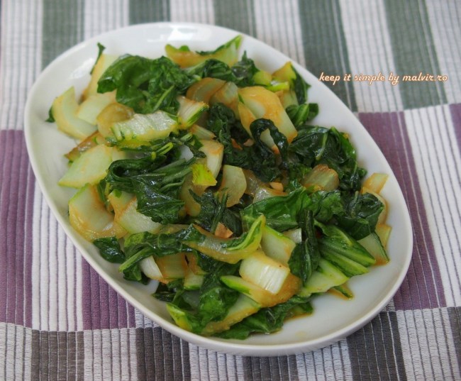 Adaugati uleiul de masline in wok si caliti usturoiul si ghimbirul timp de 1 minut. Adaugati varza chinezeasca si sosul de soia si mai caliti timp de 3-5 minute pana varza se patrunde putin dar ramane crocanta.