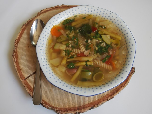 Caliti ceapa in ulei de masline timp de 3 minute apoi adaugati restul de legume si lasati pe foc pana se calesc toate amestecand sa nu se arda. Adaugati apa si fierbeti tip de 30 de minute pana se inmoaie legumele apoi adaugati pastele si mai fierbeti timp de 5-8 minute impreuna. Potriviti de sare si piper.