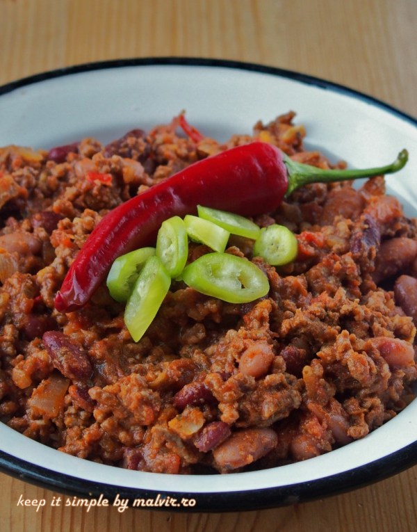 Chili con carne este un preparat in stil mexican cu carne tocata, rosii, fasole si ardei iute. Daca nu doriti sa fie iute, preparati-l fara ardei iute si serviti mancarea cu sos salsa iute sau cu rondele de ardei iute (aceasta optiune am incercat-o si eu de cateva ori si a fost potrivita pentru copii).