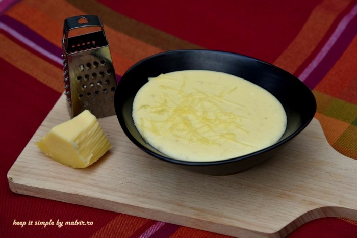 Cand sosul incepe sa fiarba, adaugati branza si lasati sa fiarba incet pana se topeste, apoi adaugati smantana cu galbenusul de ou si luati de pe foc. Adaugati untul, omogenizati si lasati putin sub capac pana la servire.