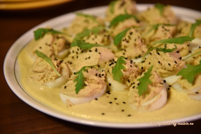 Intindeti maioneza pe un platou si asezati ouale umplute deasupra; ornati ouale cu verdeata deasupra sau feliute de ardei rosu, seminte de susan negru…ce aveti la indemana pentru a le face cat mai aratoase.