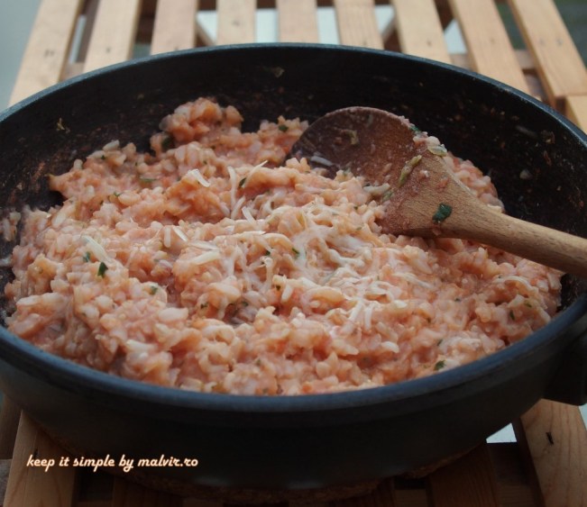 Incingeti tigaia si adaugati unt de cocos. Adaugati orezul fiert si sosul salsa si lasati 3-5 minute pe foc. Opriti focul si lasati orezul sub capac timp de 5 minute. Adaugati branza rasa deasupra si mai lasati 1 minut sa se topeasca bine.