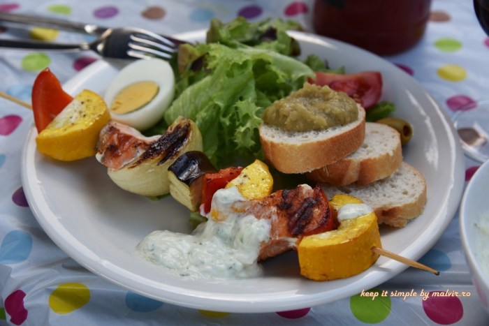 Nu stiu cum e timpul pe la voi, dar mie imi miroase deja a toamna asa ca am profitat de vremea calda si frumoasa din ultimul weekend si am facut un gratar. Am decis meniul ‘on the spot’ si am preparat cateva feluri de mancare cu legume de sezon: frigarui cu legume si somon, porumb, dovlecel, sos tzatziki, salata verde, ciuperci umplute.