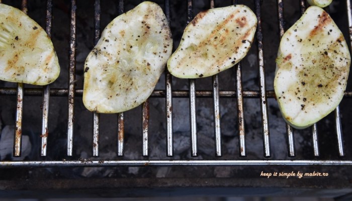 Pe langa porumbul la gratar (pe care copiii l-au servit cu putin unt si sare) am pregatit niste felii de dovlecel-patison cu sare si piper care au mers perfect ca garnitura.