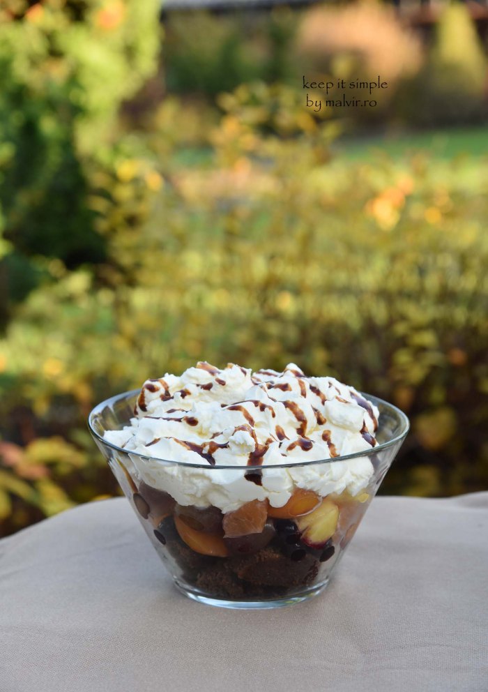O alta varianta ar fi sa pregatiti cele 6-8 portii direct in boluri de servire, punand aceleasi straturi (chech, fructe, crema) in fiecare bol.
