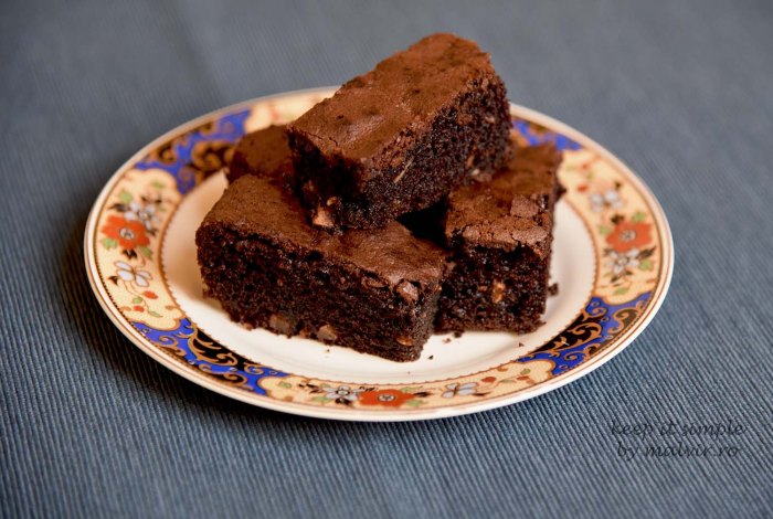 Am incercat cateva retete de brownie si aceasta mi s-a parut cea mai apropiata de gustul meu. Asa ca, here it is. Nu este foarte dulce deoarece eu folosesc ciocolata cat mai neagra (uneori cu coaja de portocala) si am redus portia de zahar de la reteta originala de la 250g la 150g. Sper sa va placa!
