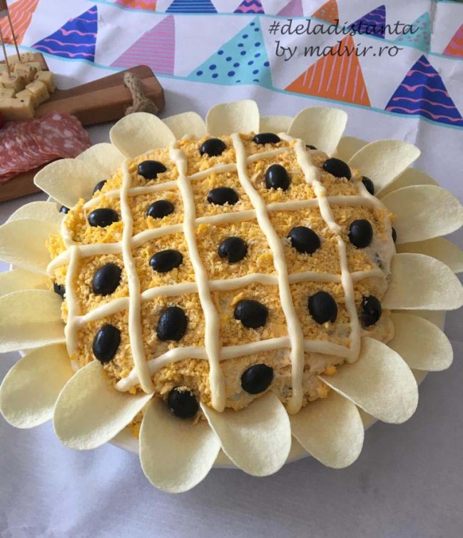 Se decoreaza deasupra cu maioneza si jumatati de masline ca in foto de mai jos; marginile se decoreaza cu chipsuri de cartofi.