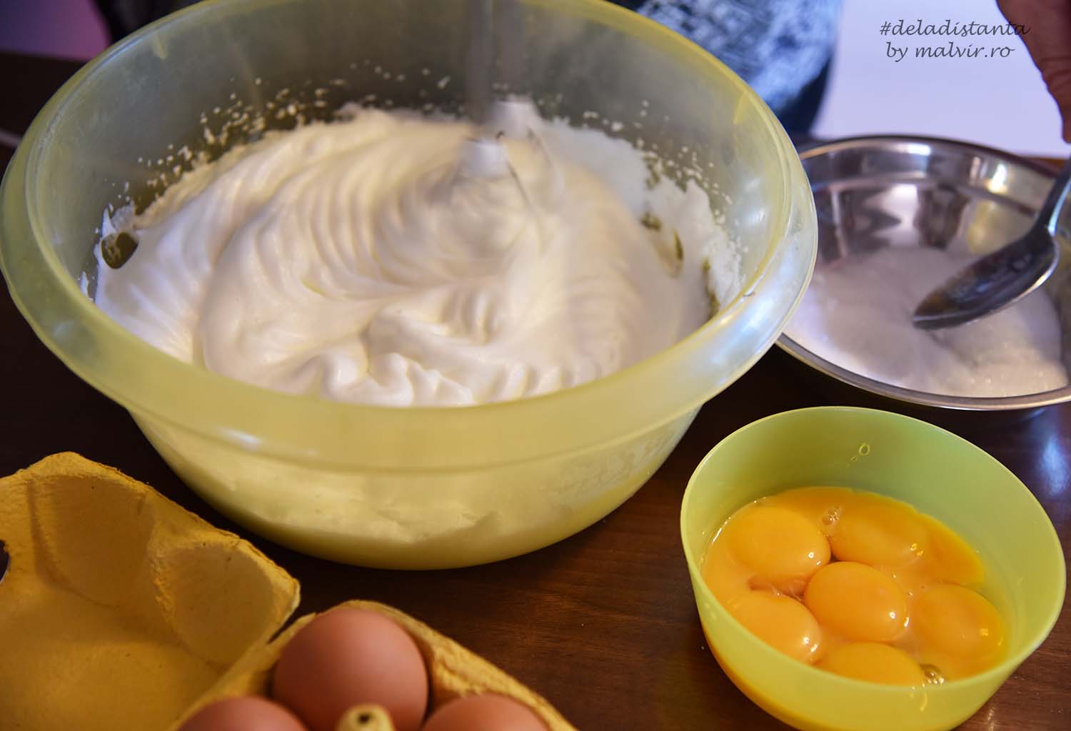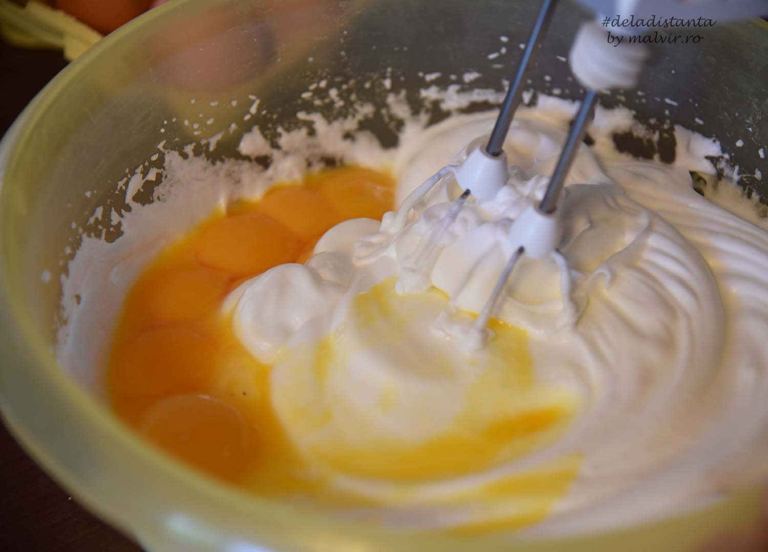 Se separa ouale. Albusurile se bat bine spuma, apoi se adauga zaharul si la sfarsit galbenusurile. Se adauga faina si se amesteca incet sa nu se inmoaie spuma.
