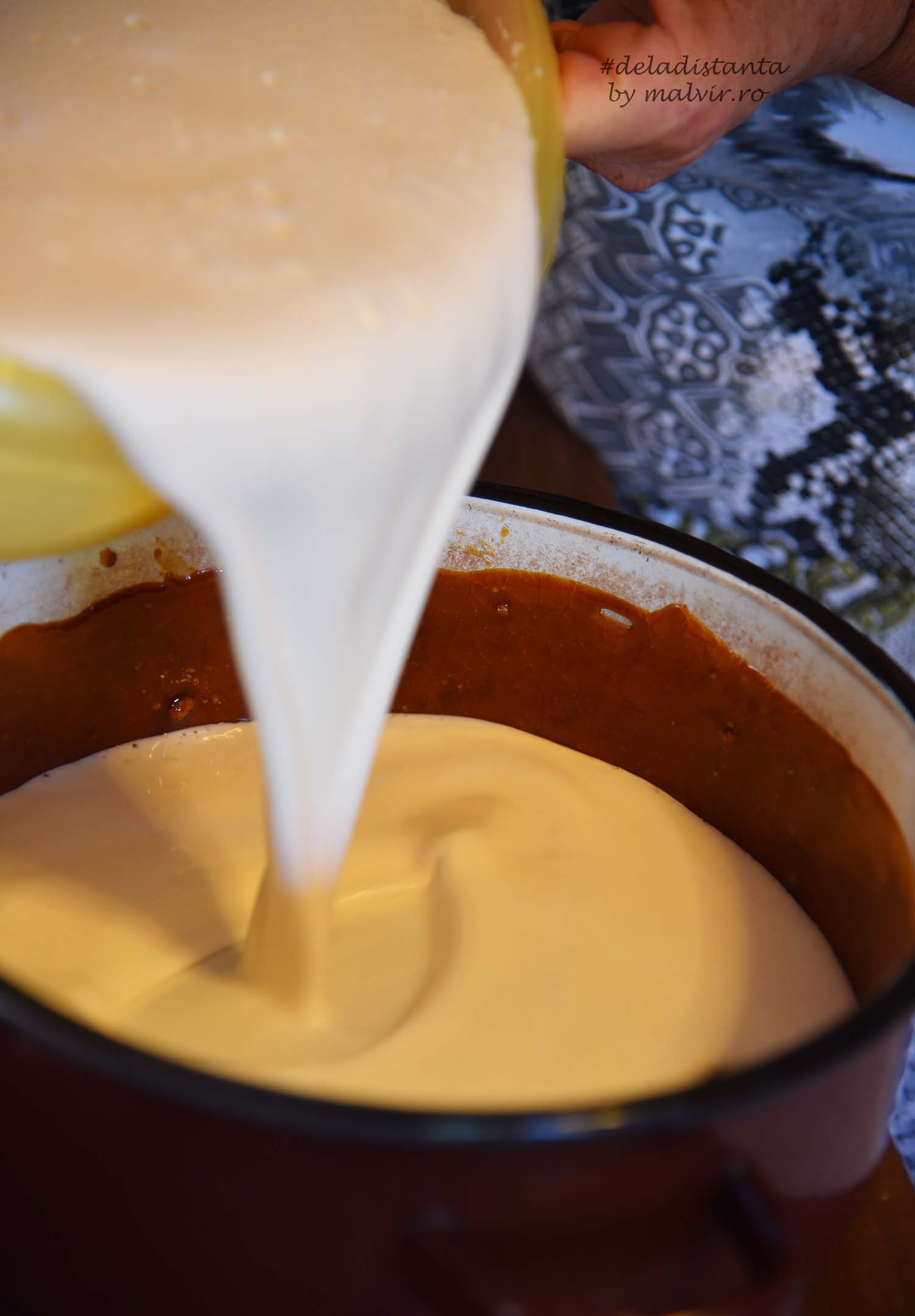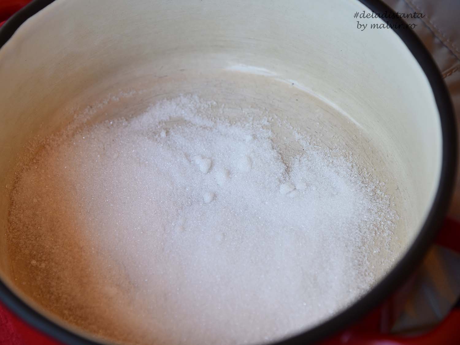 Se pun 6 linguri de zahar in cratita la foc mic si nu se amesteca pana se caramelizeaza complet. Pentru omogenizare se roteste cratita pe foc. Atentie, sa nu se arda.