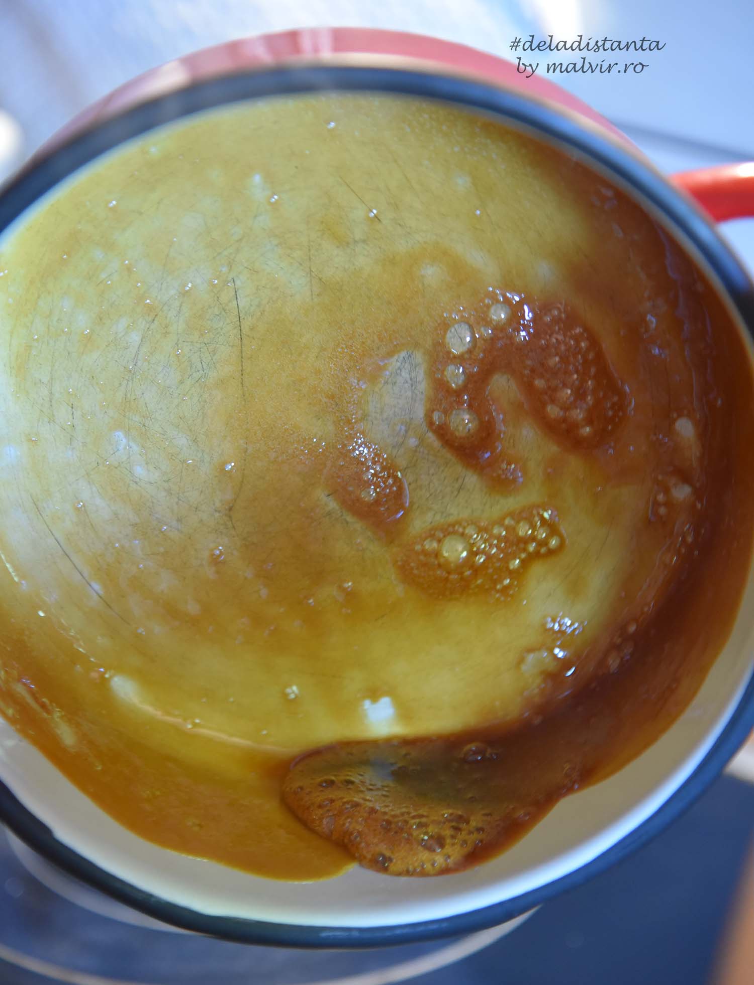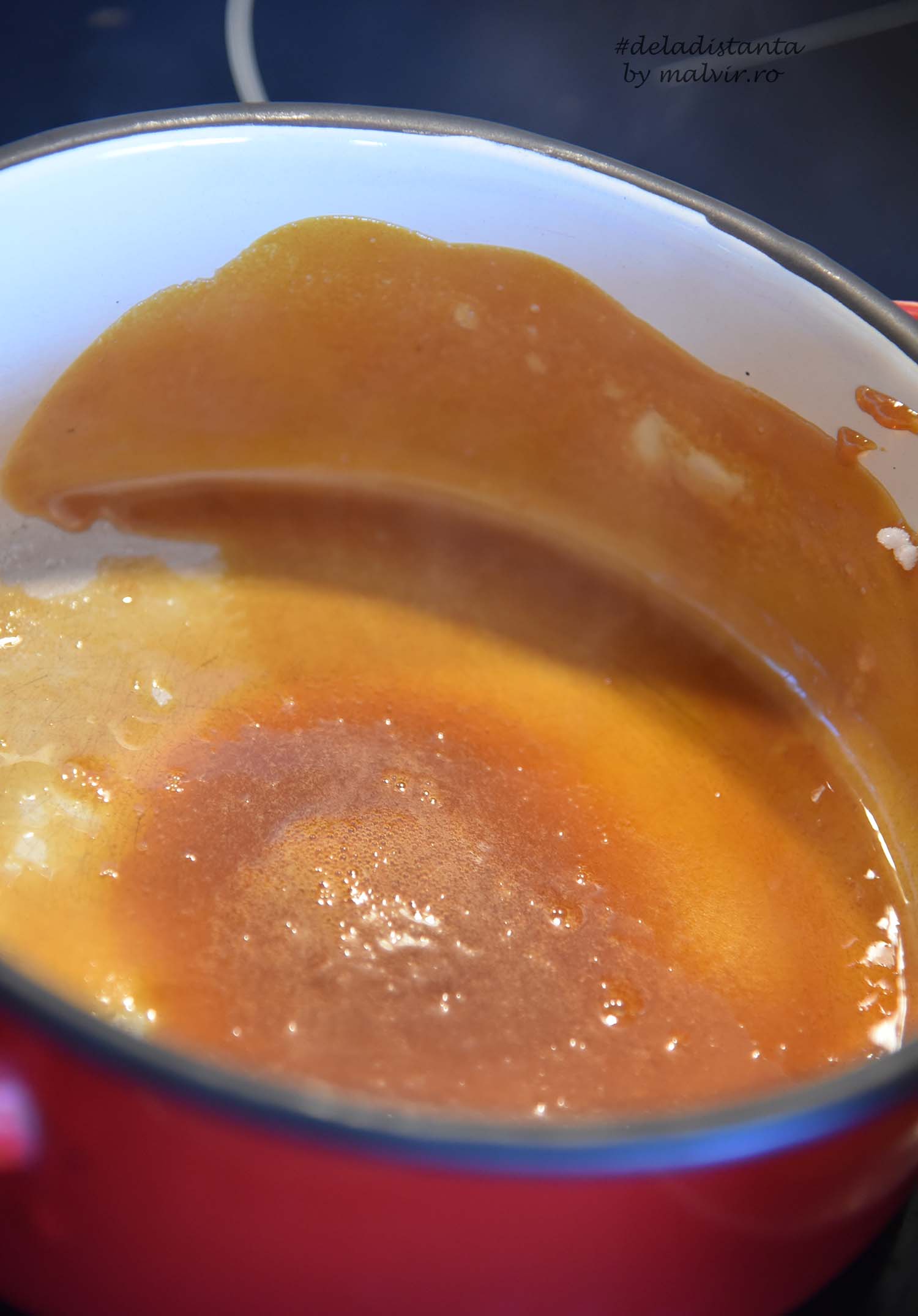 Cand este gata, se roteste cratita in asa fel incat zaharul caramelizat sa ajunga pe margini in sus aproximativ 7-8 cm.