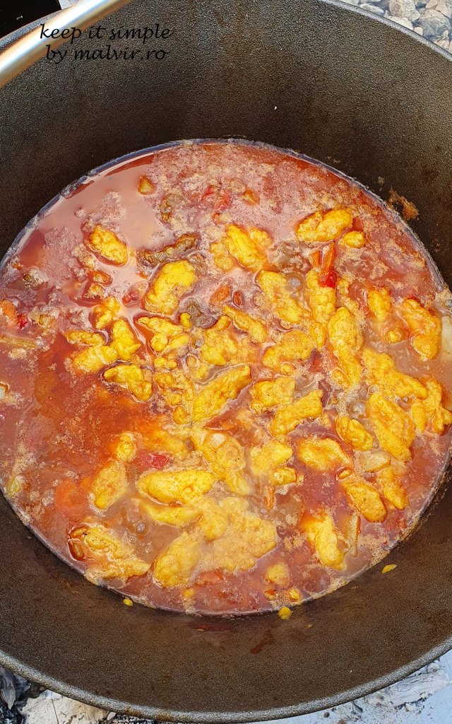 Lasati totul sa fiarba bine si adaugati apa pentru a oferi consistenta necesara unei tocanite.
