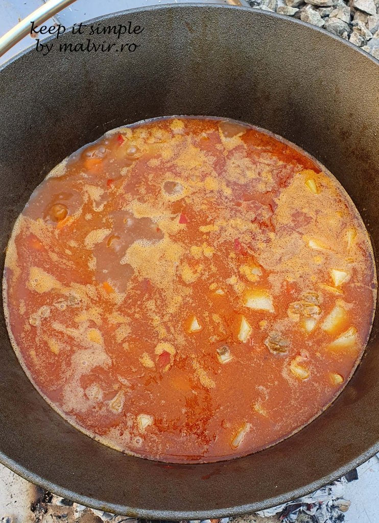 Cand carnea este aproape gata (in functie de cantitate si de intensitatea focului poate dura in jur de 1.5-2 ore), adaugati cartofii, rosiile, condimentele dupa gust si apa peste nivelul tocanitei din ceaun.
