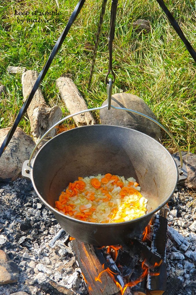 Dar inainte de a incepe, va spun ca este obligatoriu sa aveti un ceaun de fonta de marime potrivita de minim 6 l – preferabil 10 l, un suport metalic pentru ceaun, o lingura de lemn si o sita cu coada lunga. Un taburet si ustensile pentru foc sunt nice-to-have atunci cand incepeti sa preparati mancarea.