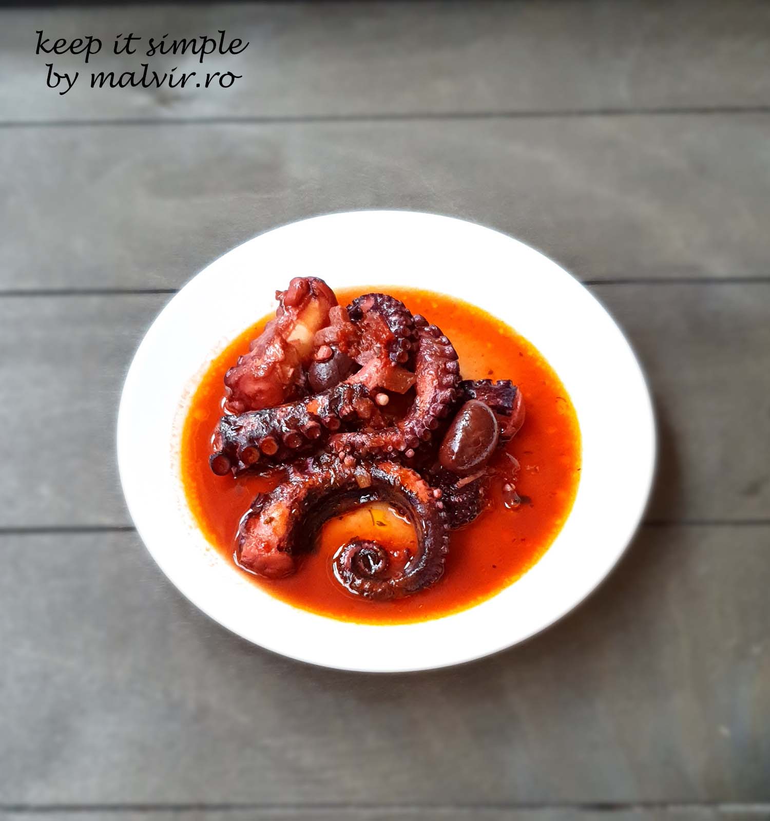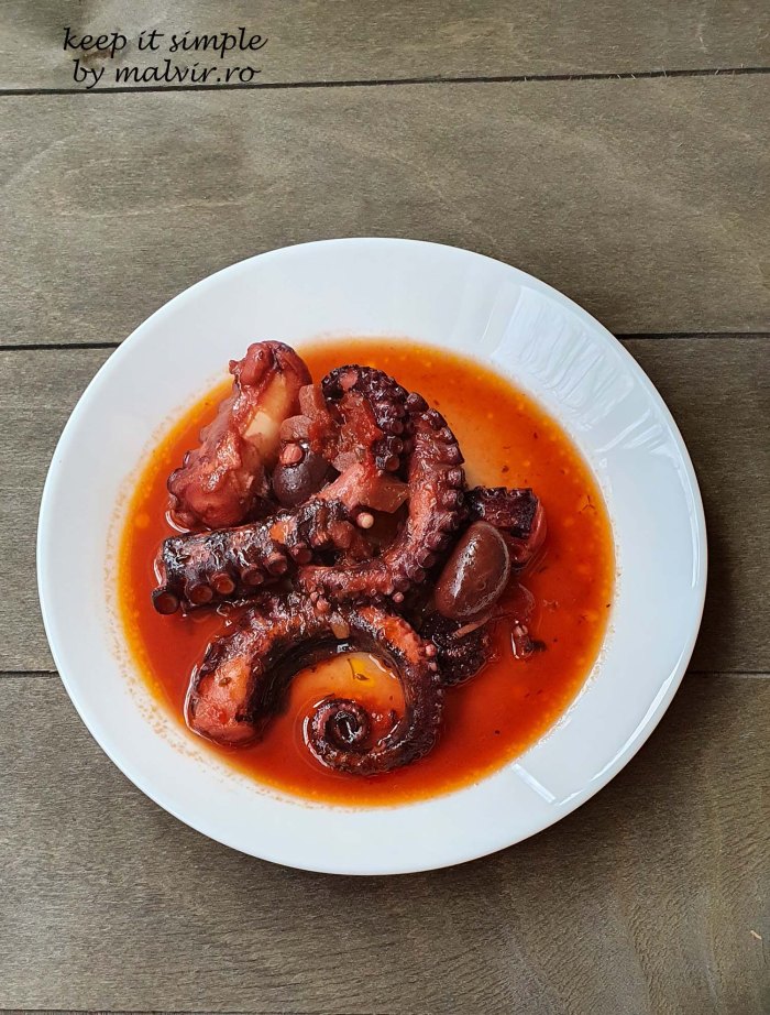 Intr-o tigaie caliti ceapa si usturoiul in ulei de masline pana se rumenesc apoi adaugati caracatita, maslinele si rosiile si mai dati un clocot. Condimentati dupa gust cu sare si piper apoi turnati continutul in oala de slow cooker, adaugati vinul, apa/supa de peste, cimbrul si maslinele.
