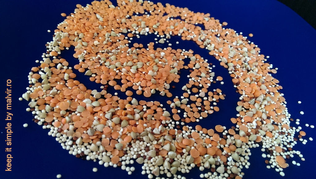 Alimente integrale – folosesc o varietate de alimente din categoria leguminoase, bogate in fibre si proteine cum ar fi: orez basmati, hrisca, quinoa, canihua, naut, linte rosie, linte verde, linte neagra, amarant, mazare, fasole, soia non-OMG .