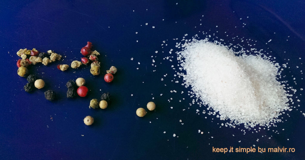 Condimente – atat pentru gatit cat si pentru servit folosesc sare de Himalaya si sare de mare si piper boabe mozaic pe care il macin cu rasnita deoarece mi se pare mult mai gustos. In rest folosesc o varietate foarte mare de condimente, pe cat posibil naturale dar si uscate. Nu folosesc niciodata cuburi concentrate si arome artificiale sau vegeta din comert. Imi place sa simt gustul natural al alimentelor.
